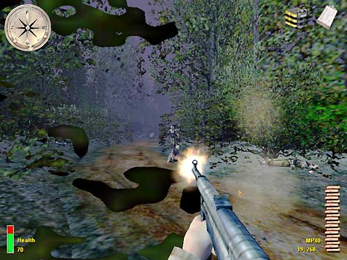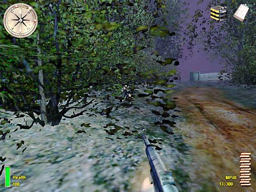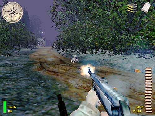 Then, turn to your right and resume your running on the road. Take the left roadside. The third german enemy is there, shooting at you. Waste the rest of your clip to kill him, so you'll get an automatic reload of the MP40 (pic. 10). Note that this guy can fire at you stood up, crouched or laid down; he can also use grenades (the same would apply for the other two germans that you've killed blindly).
