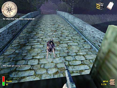 Once you're certain the road is clean of those two germans, it's time to face it definitely. Just in case, don't forget to quicksave and reload your preferred weapon. I still prefer the MP40. The shotgun is good enough only for close combat.