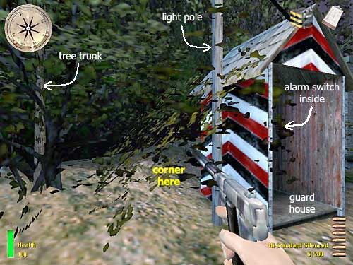 Get out of the corner and get inside the guard house. Change weapon to the Hi-Standard Silenced pistol and face the alarm switch. Quicksave. Then, turn ON the alarm. As soon as the alarm goes on, turn it OFF. Get out of the guard house and head to the main gate. Take cover at its right pillar. Two respawned (new) enemies will come from behind to see what's going on. Ambush them (pic. 6).