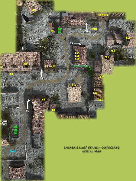 Note: The reader Bruce L. warned me about the 22th enemy (E7, on the map), that I had overlooked. He also informed that "the script for this level kills off 1 sniper (for randomness) when it spawns the level when difficulty is on hard. Otherwise it kills off 4 snipers for the other difficulty levels". That's a very interesting piece of information (Thanks B.L. !!).