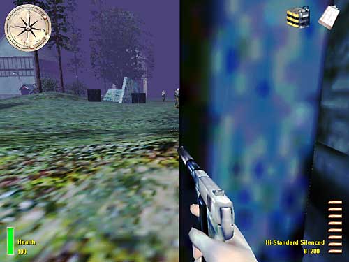 Note 1: You may use the hi-standard silenced pistol to fire at the shooting area, instead of the MP40. Indeed, this weapon is way more effective than the MP40. If you fire two clips (16 rounds) scattered all over the shooting area, chances are that you'll kill both of them. The only minor drawbacks are that you have no sound clue about the enemies being shot and there is no replacement ammo for this weapon.