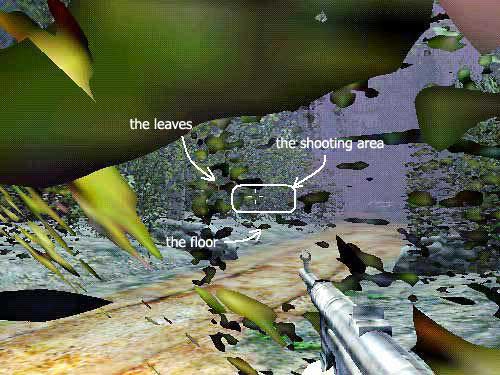 The target zone, or shooting area, is very restricted. It's located just above the floor (that light gray texture -obviously shooting the floor is useless), and to the left of the road, near some leaves (pic. 5). Note that the leaves are not still, they're constantly swaying due to the breeze, making it a little harder to mark the right shooting area. Also, the leaves seem to be randomly distributed so do not trust their position but instead pay attention to the extension of the shooting area, as shown in the picture.